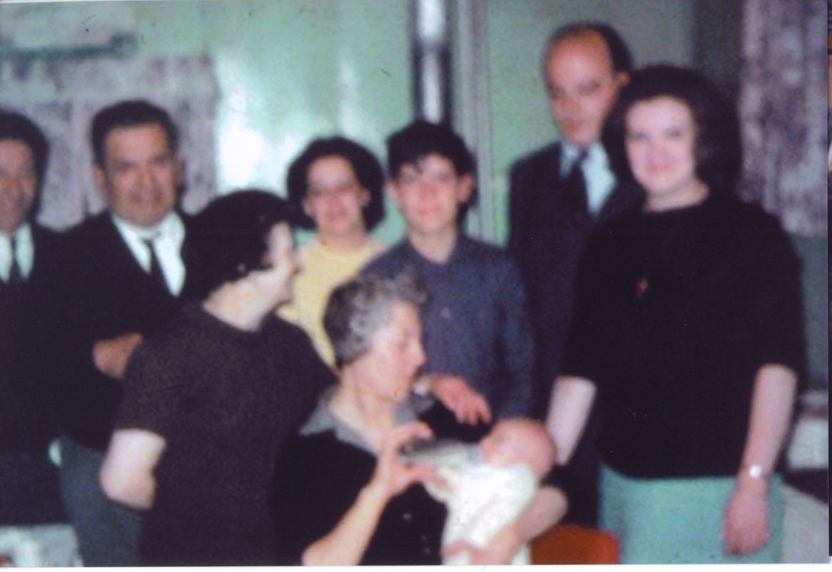 Despues del bautirmos de Luis, Catalina le da la mamadera. Detras, Antonio Manetto; Felipe y Maria Romero; Margarita Manetto y su hijo Horacio; Luis padre y Chupi.